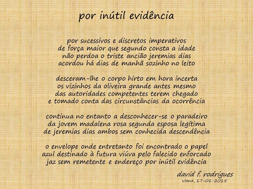 NB1 - O retrato do Poeta que acompanha o poema é da autoria do escultor Jorge Ulisses, original publicado, pela primeira vez, em Mealibra - Revista de cultura, do CCAM, n.º 1, agosto de 982, p.13. A fotografia foi colhida em Google+ / Imagens / Eugénio de Andrade.